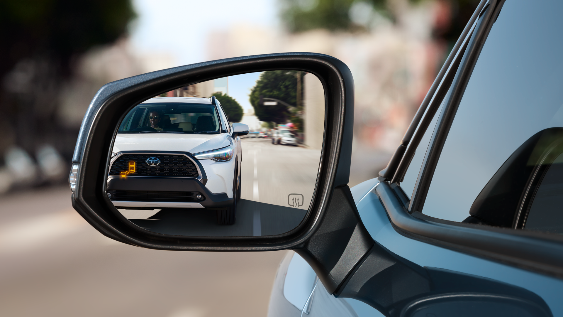 The Corolla Cross’s tech is more than just convenient; it is also designed to help keep you safe. The available Adaptive Front-Lighting System follows the road as you turn, for enhanced visibility at night. The available Blind Spot Monitor with Rear Cross-Traffic Alert is designed to help look out for your safety. BSM warns you when it detects that a vehicle in the next lane has entered Corolla Cross’s blind spot on either side of the vehicle. And when you’re in reverse, RCTA helps detect vehicles approaching from either side, warning you with side mirror indicators and a warning tone. Corolla Cross comes standard with an Advanced Airbag System. Nine airbags in total—all designed with safety in mind.
