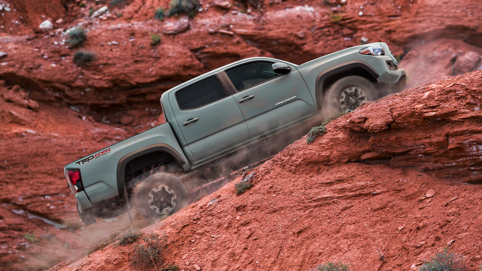 Tacoma TRD Off-Road features Multi-Terrain Select (MTS). With five modes to choose from, this system helps regulate wheelspin by automatically adjusting the engine throttle and traction control. When the trail gets demanding, Tacoma’s available Multi-Terrain Monitor lets you check your immediate surroundings for potential obstacles. Available Bilstein® shocks know how to keep their cool under pressure, delivering consistent performance when the going gets rough. Standard on TRD Off-Road, these shocks help soak up the impacts of the trail, thanks to high-performance components and valving tuned specifically for off-road driving.