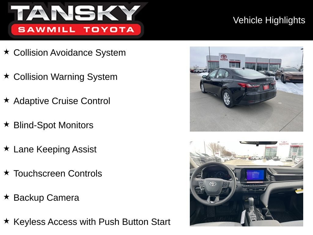 2026 Toyota Camry LE - This Toyota Camry has many features and is well equipped including, Collision Avoidance System, Collision Warning System, Adaptive Cruise Control, Blind-Spot Monitors, Lane Keeping Assist, Touchscreen Controls, Backup Camera, Keyless Access with Push Button Start, Automatic Headlights, Apple CarPlay, Android Auto, Bluetooth® Hands-Free.