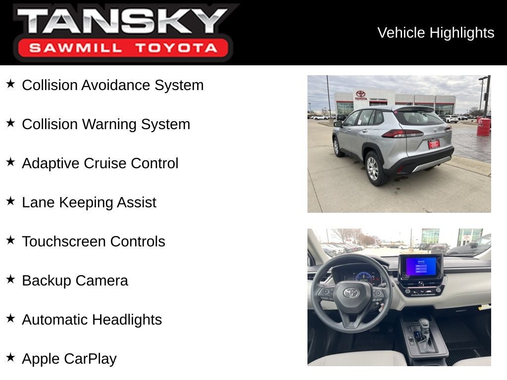 2026 Toyota Corolla Cross L - This Toyota Corolla Cross has many features and is well equipped including, Collision Avoidance System, Collision Warning System, Adaptive Cruise Control, Lane Keeping Assist, Touchscreen Controls, Backup Camera, Automatic Headlights, Apple CarPlay, Android Auto, Bluetooth® Hands-Free, Remote Keyless Entry.