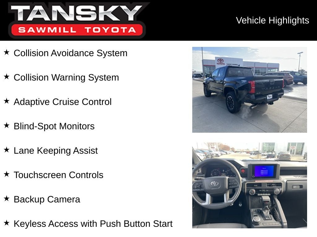 2026 Toyota Tacoma TRD Sport - This Toyota Tacoma has many features and is well equipped including, Collision Avoidance System, Collision Warning System, Adaptive Cruise Control, Blind-Spot Monitors, Lane Keeping Assist, Touchscreen Controls, Backup Camera, Keyless Access with Push Button Start, Automatic Headlights, Apple CarPlay, Android Auto, Bluetooth® Hands-Free.