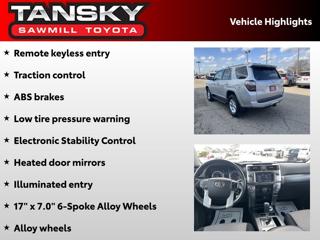 2016 Classic Silver Metallic Toyota 4Runner SR5 17 x 7.0 6-Spoke Alloy Wheels, ABS brakes, Alloy wheels, Electronic Stability Control, Heated door mirrors, Illuminated entry, Low tire pressure warning, Remote keyless entry, Traction control.