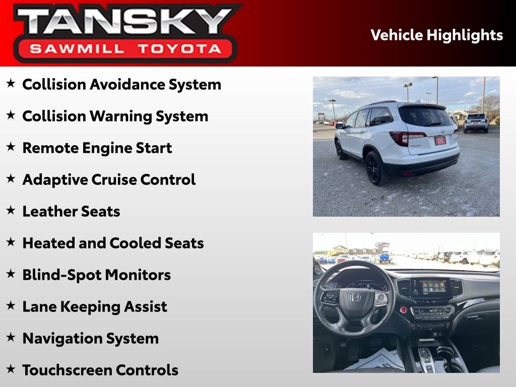2021 Platinum White Pearl Honda Pilot Black Edition - This Honda Pilot has many features and is well equipped including, Collision Avoidance System, Collision Warning System, Remote Engine Start, Adaptive Cruise Control, Leather Seats, Heated and Cooled Seats, Blind-Spot Monitors, Lane Keeping Assist, Navigation System, Touchscreen Controls, Backup Camera, Keyless Access with Push Button Start, Automatic Headlights, Apple CarPlay, Android Auto, Bluetooth® Hands-Free, Power Liftgate, Panoramic Moonroof.