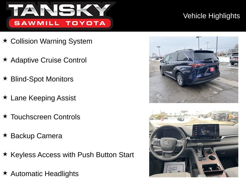 Certified. 2021 Blueprint Toyota Sienna LE - This Toyota Sienna has many features and is well equipped including, Collision Warning System, Adaptive Cruise Control, Blind-Spot Monitors, Lane Keeping Assist, Touchscreen Controls, Backup Camera, Keyless Access with Push Button Start, Automatic Headlights, Apple CarPlay, Android Auto, Bluetooth® Hands-Free.
