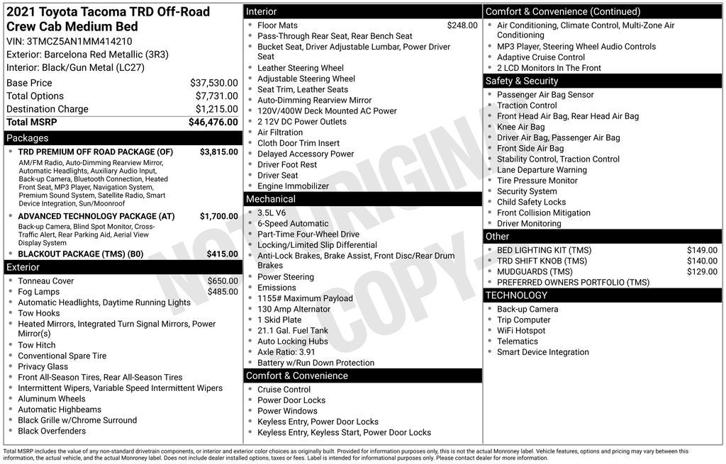 2021 Barcelona Red Metallic Toyota Tacoma TRD Off-Road ABS brakes, Alloy wheels, Electronic Stability Control, Front dual zone A/C, Heated door mirrors, Illuminated entry, Low tire pressure warning, Remote keyless entry, Traction control.