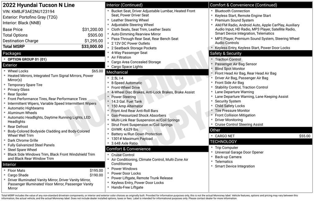 2022 Portofino Gray Hyundai Tucson N Line - This Hyundai Tucson has many features and is well equipped including, Collision Avoidance System, Remote Engine Start, Heated Seats, Blind-Spot Monitors, Lane Keeping Assist, Backup Camera, Keyless Access with Push Button Start, Automatic Headlights, Apple CarPlay, Android Auto, Bluetooth® Hands-Free, Power Liftgate.