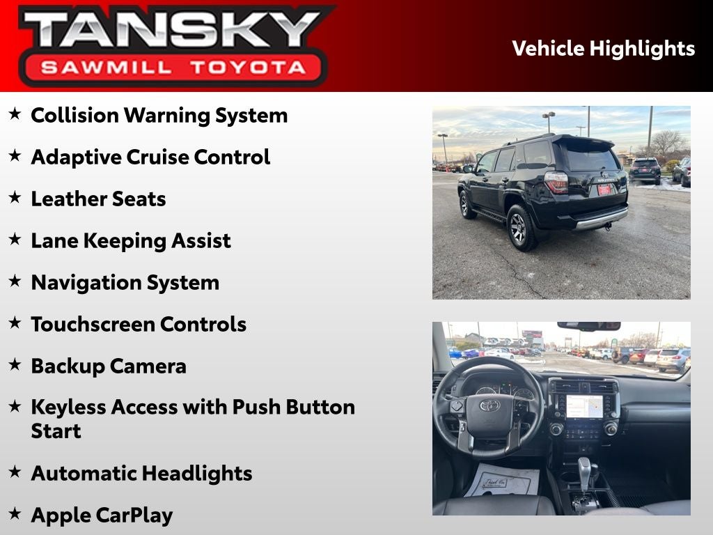2023 Black Toyota 4Runner TRD Off-Road Premium - This Toyota 4Runner has many features and is well equipped including, Collision Warning System, Adaptive Cruise Control, Leather Seats, Lane Keeping Assist, Navigation System, Touchscreen Controls, Backup Camera, Keyless Access with Push Button Start, Automatic Headlights, Apple CarPlay, Android Auto, Bluetooth® Hands-Free, Moonroof.