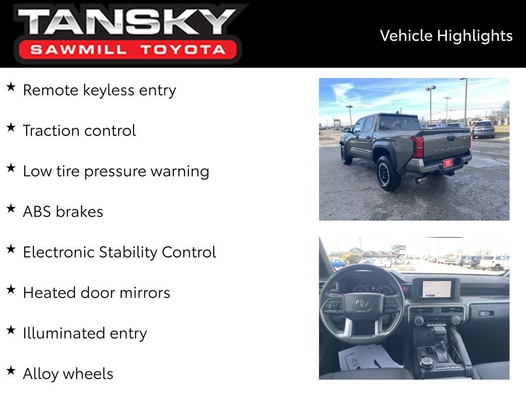 2024 Bronze Oxide Toyota Tacoma TRD Off-Road ABS brakes, Alloy wheels, Electronic Stability Control, Heated door mirrors, Illuminated entry, Low tire pressure warning, Remote keyless entry, Traction control.