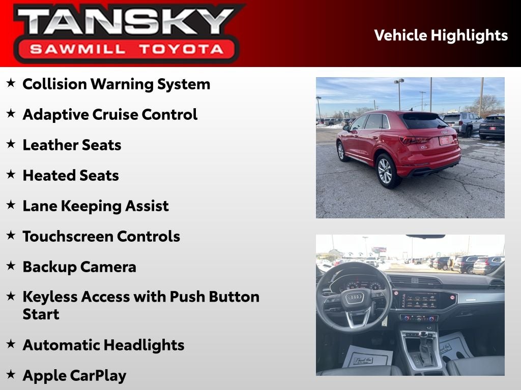 2025 Progressive Red Metallic Audi Q3 Premium - This Audi Q3 has many features and is well equipped including, Collision Warning System, Adaptive Cruise Control, Leather Seats, Heated Seats, Lane Keeping Assist, Touchscreen Controls, Backup Camera, Keyless Access with Push Button Start, Automatic Headlights, Apple CarPlay, Android Auto, Bluetooth® Hands-Free, Power Liftgate, Panoramic Moonroof.
