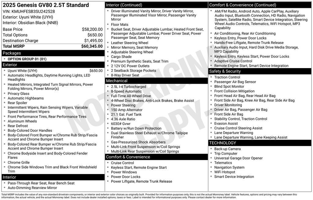 2025 Uyuni White Genesis GV80 2.5T - This Genesis GV80 has many features and is well equipped including, Collision Avoidance System, Remote Engine Start, Adaptive Cruise Control, Leather Seats, Heated Seats, Blind-Spot Monitors, Lane Keeping Assist, Navigation System, Backup Camera, Keyless Access with Push Button Start, Automatic Headlights, Apple CarPlay, Android Auto, Bluetooth® Hands-Free, Wi-Fi Hotspot, Power Liftgate.