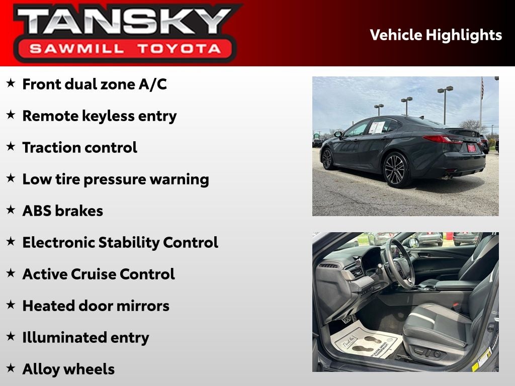 2025 Midnight Black Metallic Toyota Camry SE ABS brakes, Active Cruise Control, Alloy wheels, Electronic Stability Control, Front dual zone A/C, Heated door mirrors, Illuminated entry, Low tire pressure warning, Remote keyless entry, Traction control.
