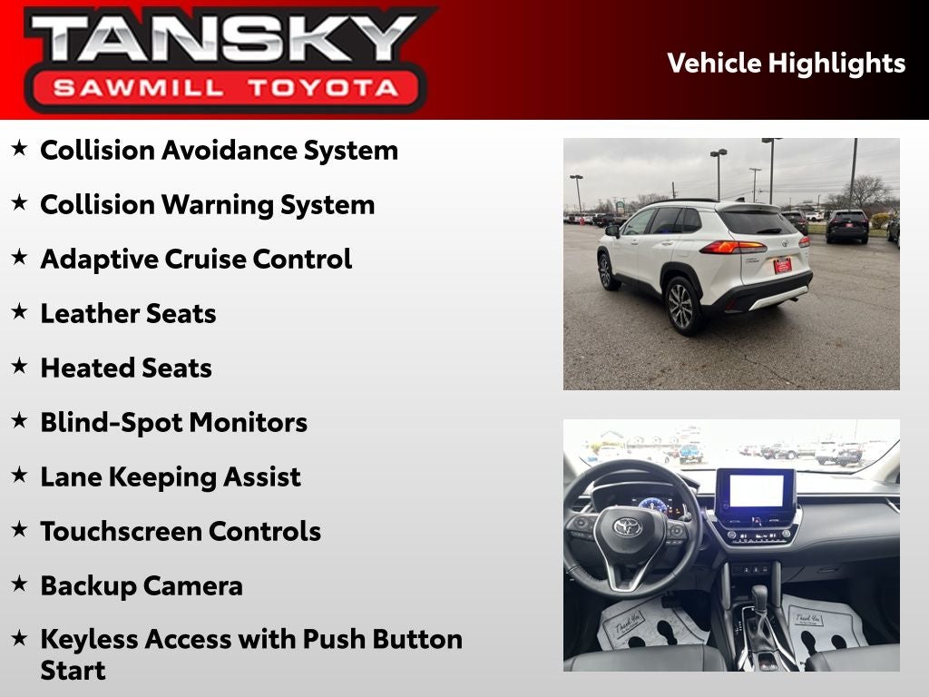2025 Wind Chill Pearl/Jet Black Toyota Corolla Cross XLE - This Toyota Corolla Cross has many features and is well equipped including, Collision Avoidance System, Collision Warning System, Adaptive Cruise Control, Leather Seats, Heated Seats, Blind-Spot Monitors, Lane Keeping Assist, Touchscreen Controls, Backup Camera, Keyless Access with Push Button Start, Automatic Headlights, Apple CarPlay, Android Auto, Bluetooth® Hands-Free, Power Liftgate, Moonroof.